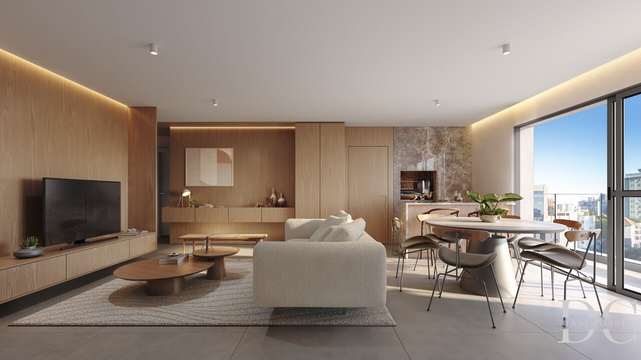 1 apartamento por andar com hall privativo de frente, living com sacada em 3 ambientes, lavabo, sala de estar, sala de jantar junto ao espaço gourmet com churrasqueira. Copa cozinha, área de serviço com dependência completa e entrada independente.