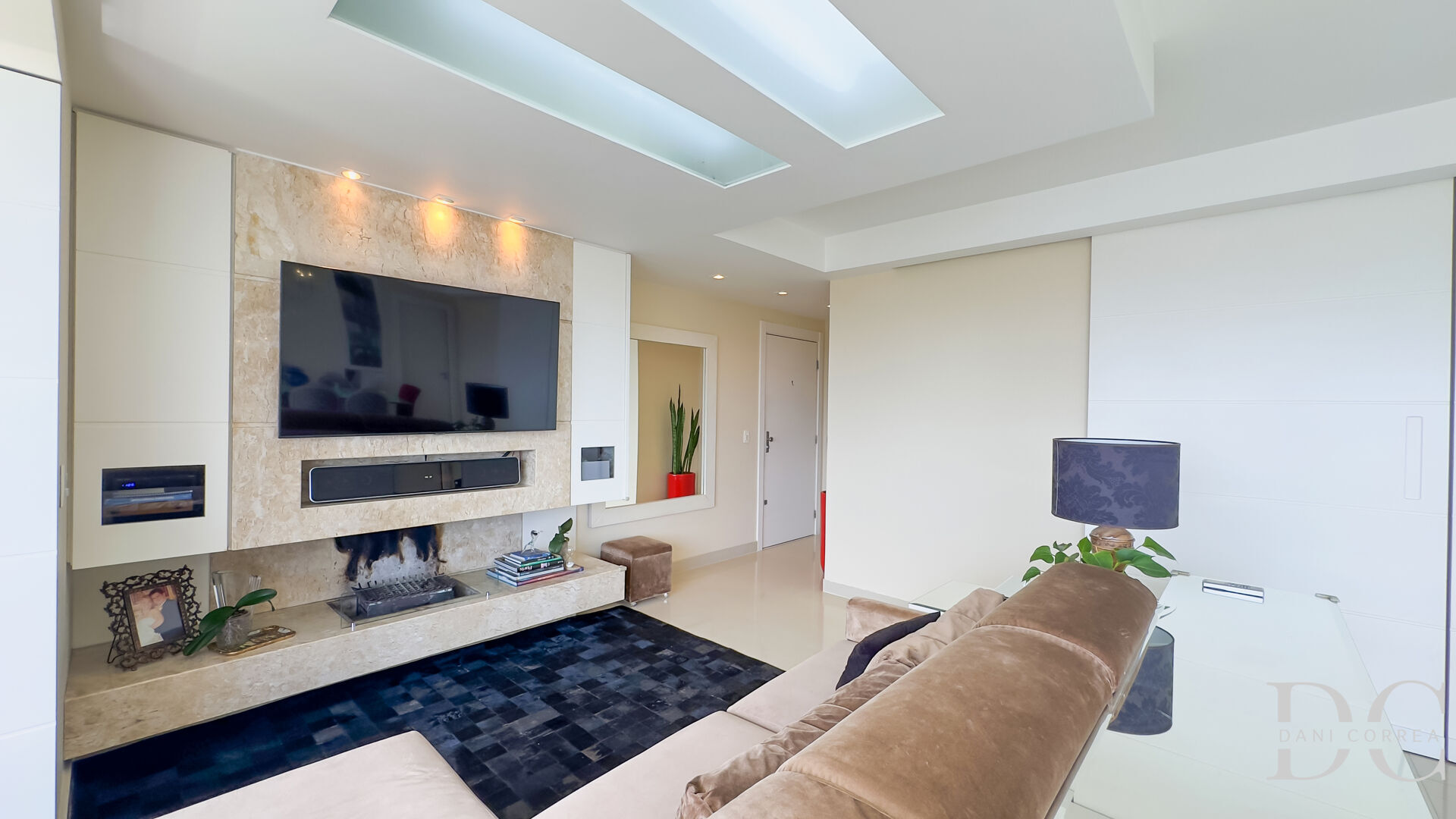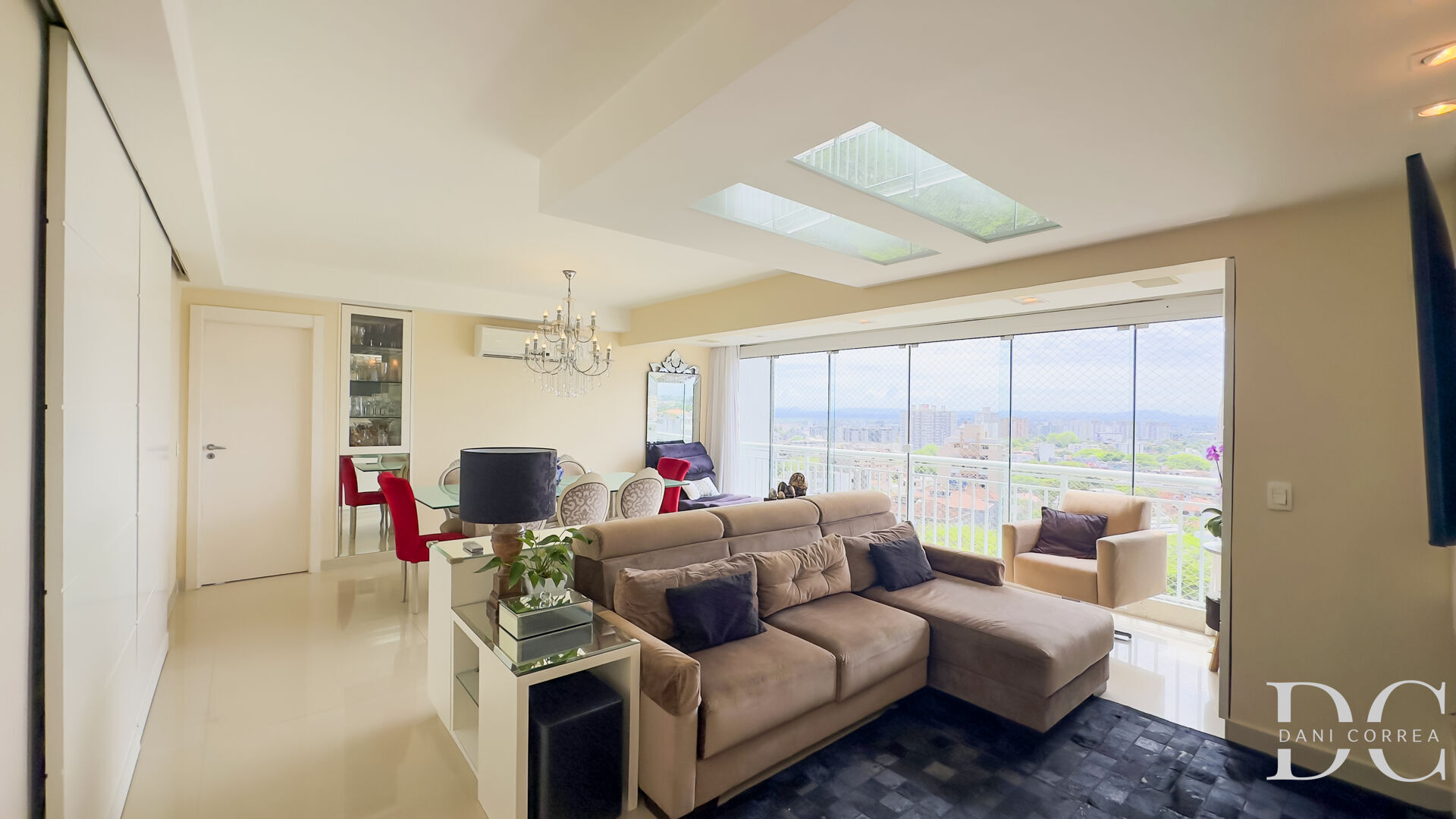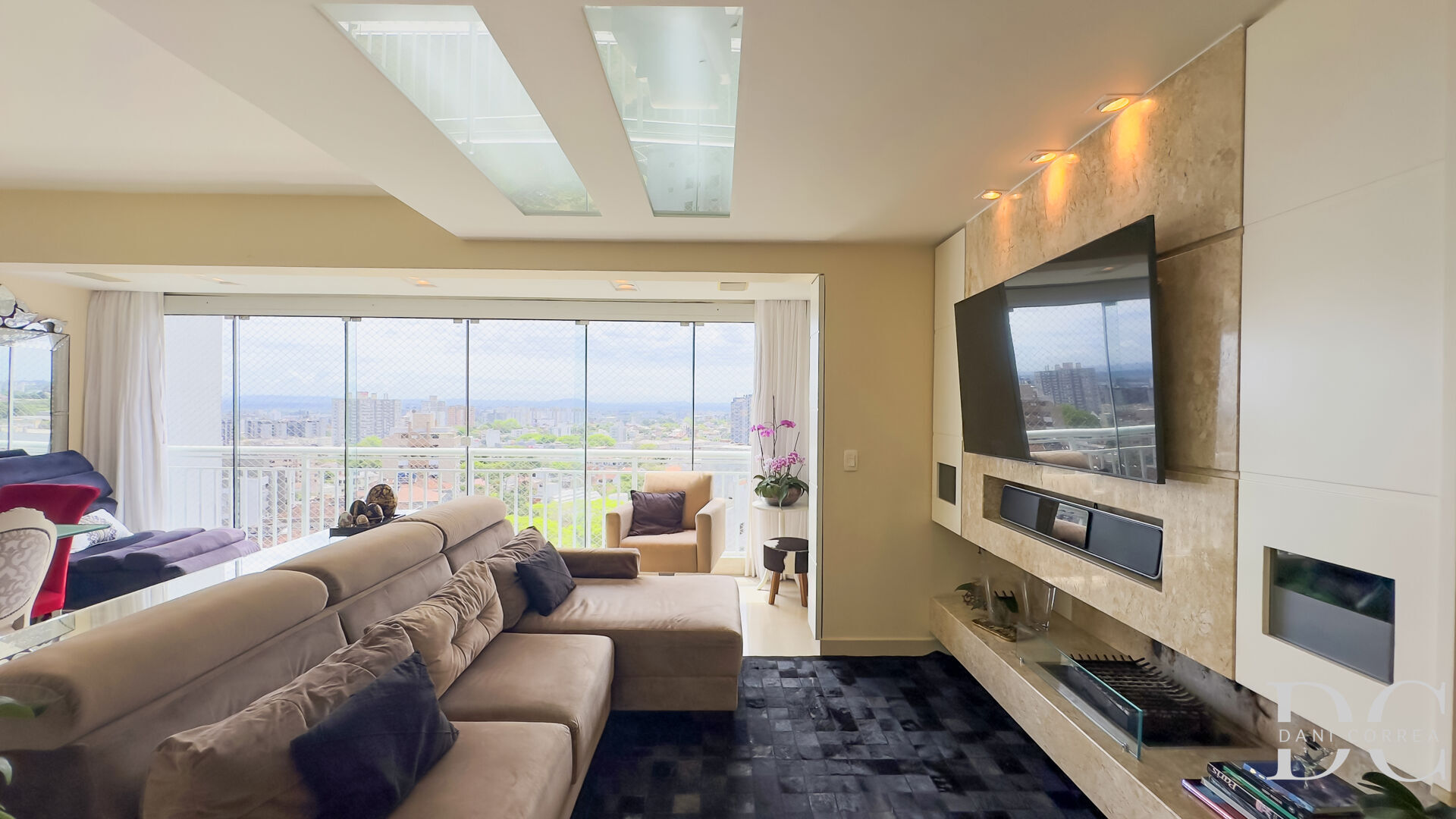 Living perfeito com sacada integrada, espaço churrasco com parrilla, sala de estar com lareira, lavabo.