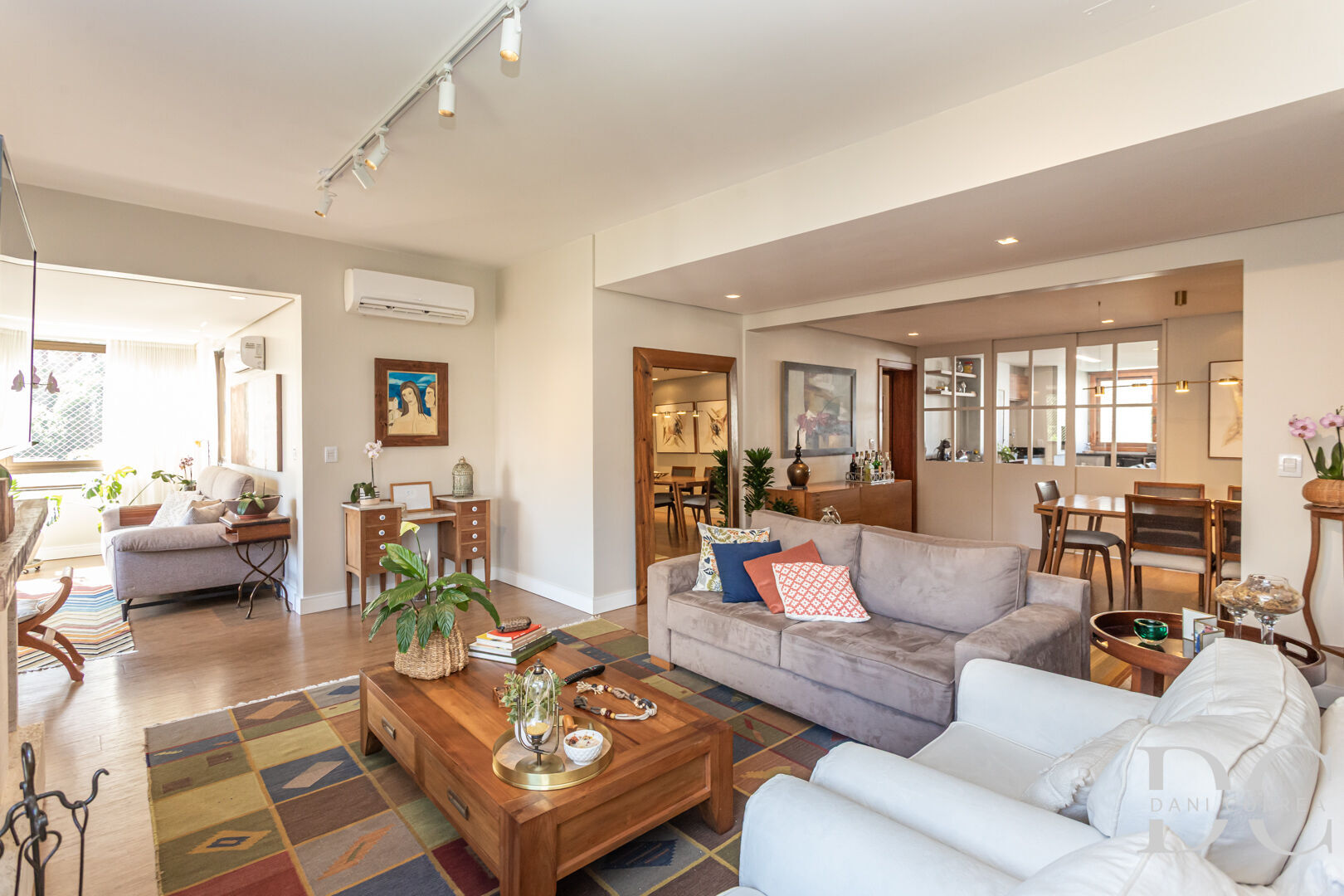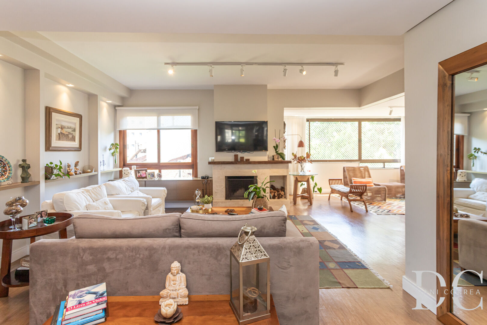 Living generoso e iluminado com três ambientes, sala de estar com lareira, sala de jantar e sala de TV e lavabo.