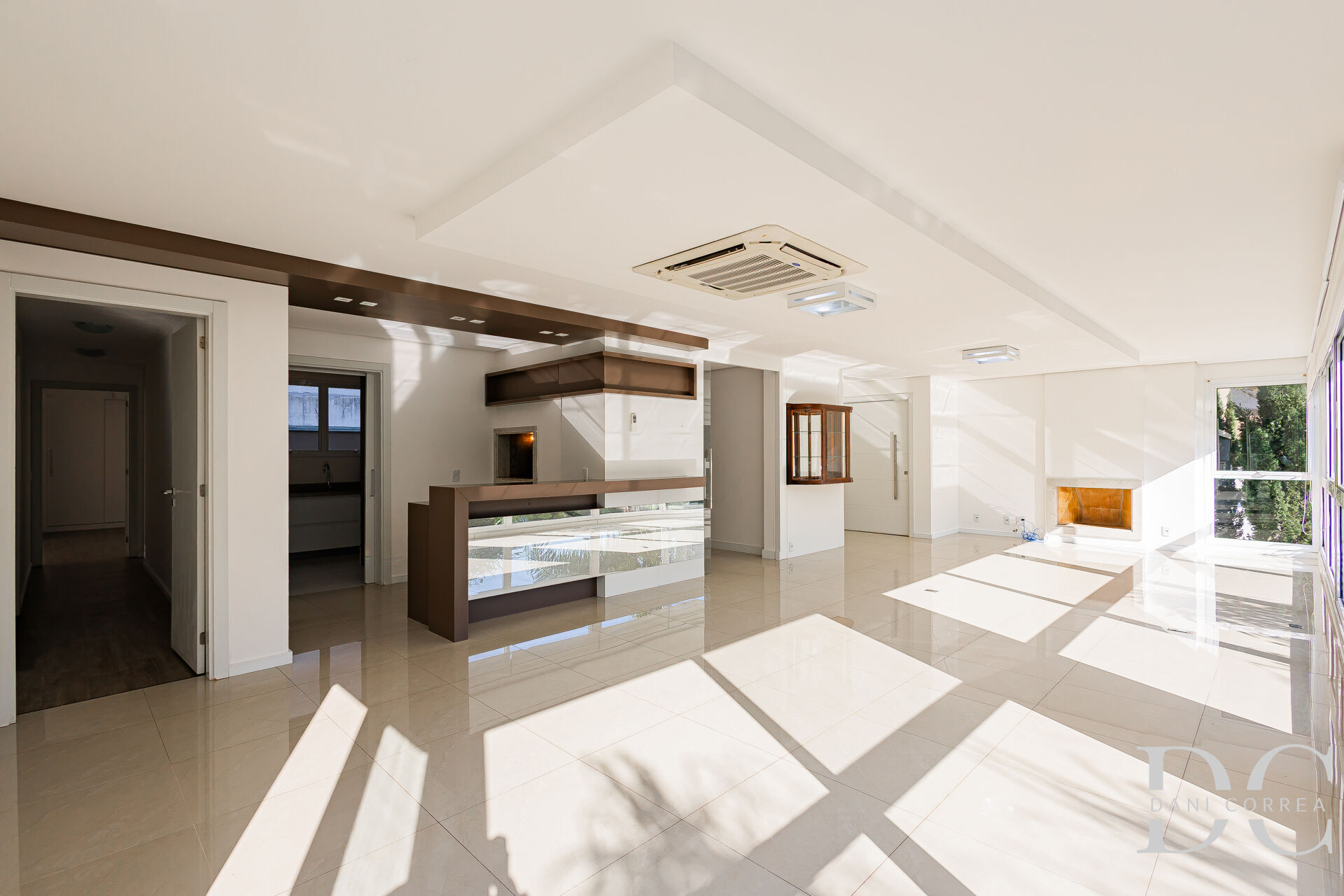 Hall privativo, living amplo com janelões em toda extensão proporcionando muita luz natural, sala estar com lareira, jantar integrado com espaço gourmet com churrasqueira, lavabo e gabinete.