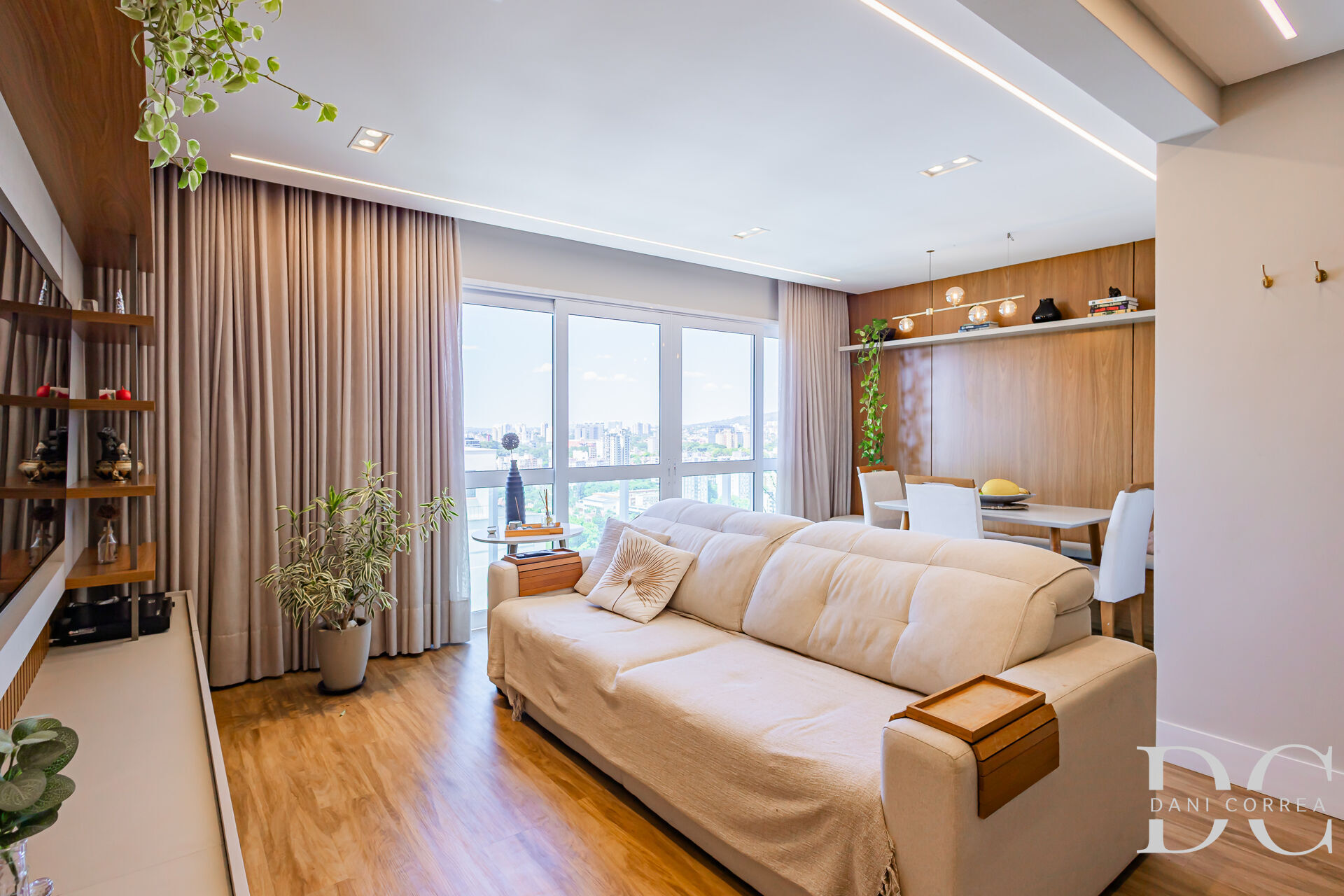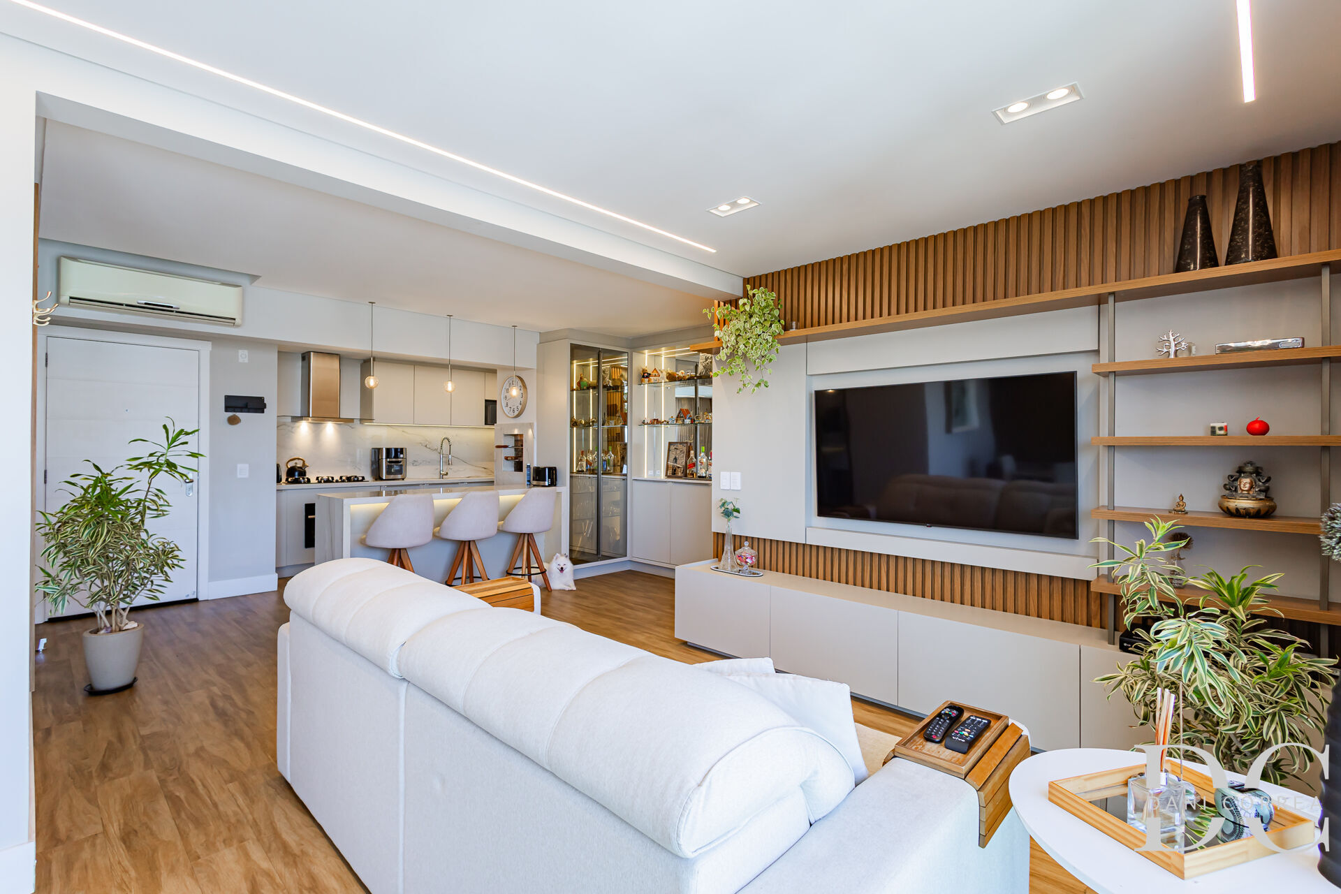 Semi mobiliado em 97m² privativos com living em 2 ambientes, cozinha americana com uma bancada que conecta a cozinha com churrasqueira ao living. Área de serviço separada muito ventilada.