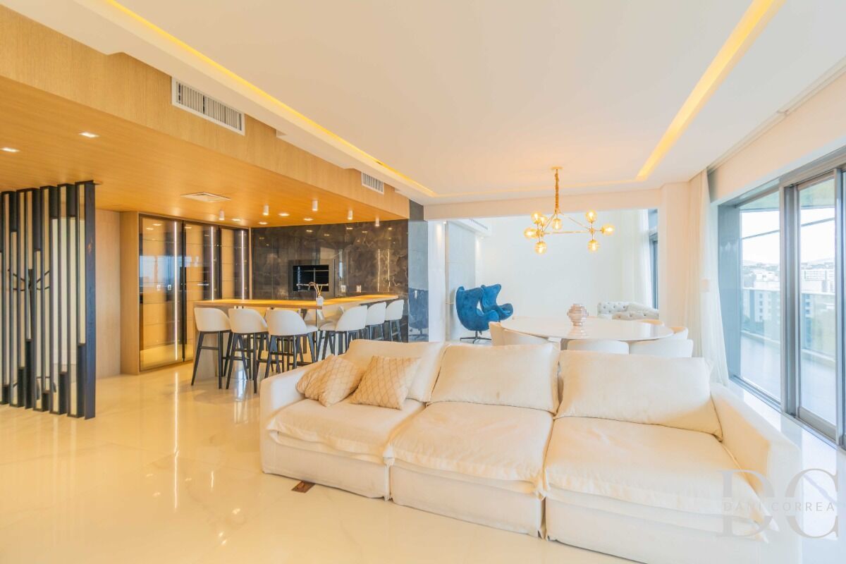 Hall privativo com elevador codificado, amplo com living para 4 ambientes com pé direito duplo todo envidraçado, lareira, espaço churrasco para 2 ambientes, sala de jantar e sacada com vista definitiva.