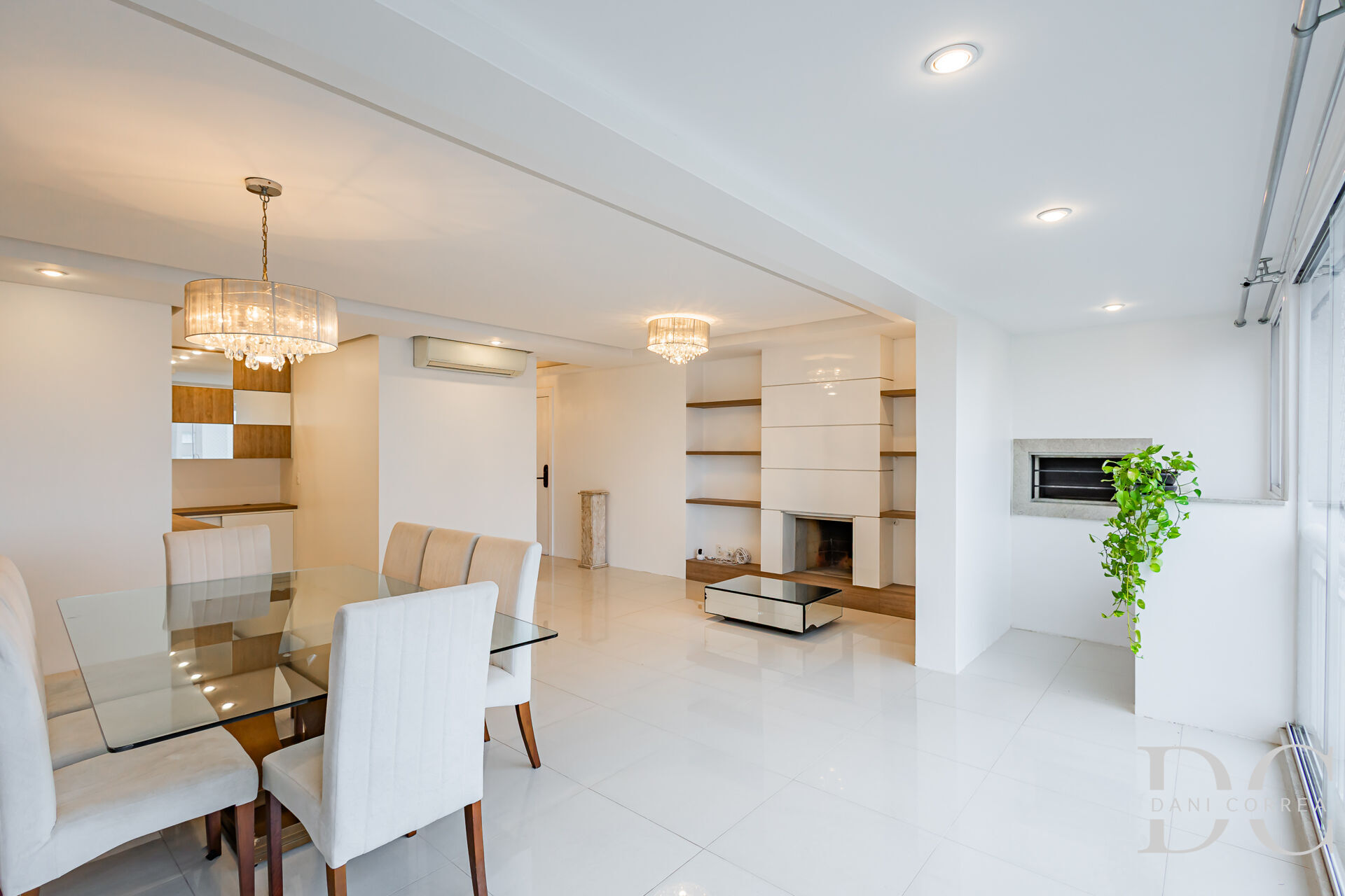 Com 148m² privativos tem living estendido sala de estar com lareira, sala de jantar, sacada com churrasqueira integrada ao living.