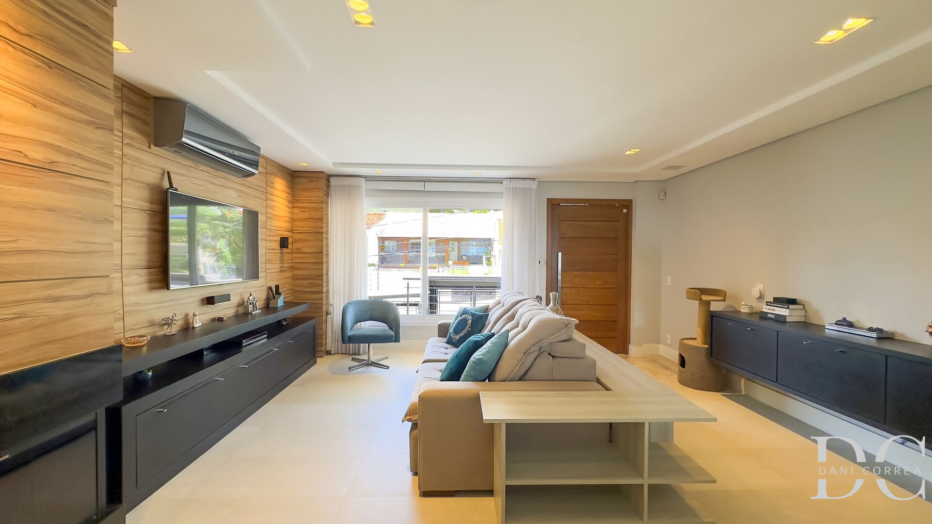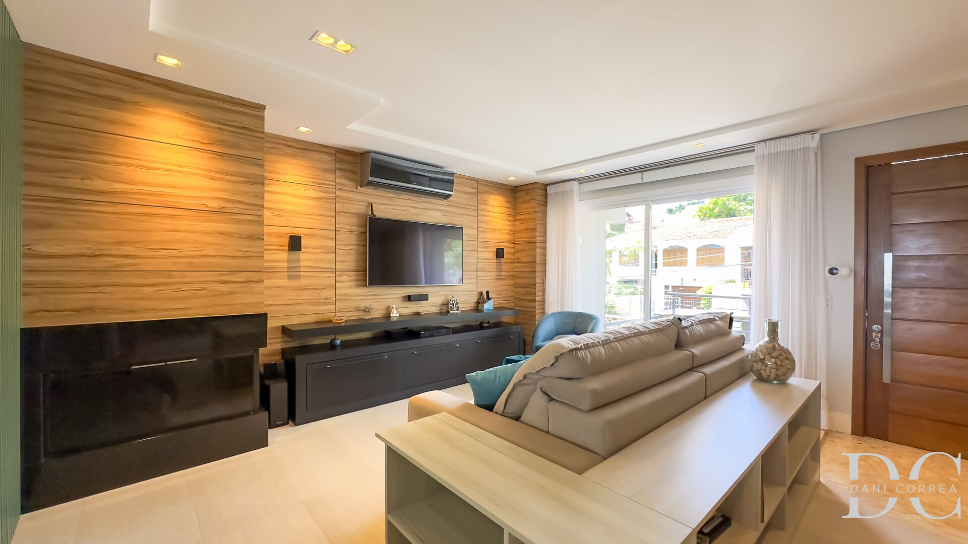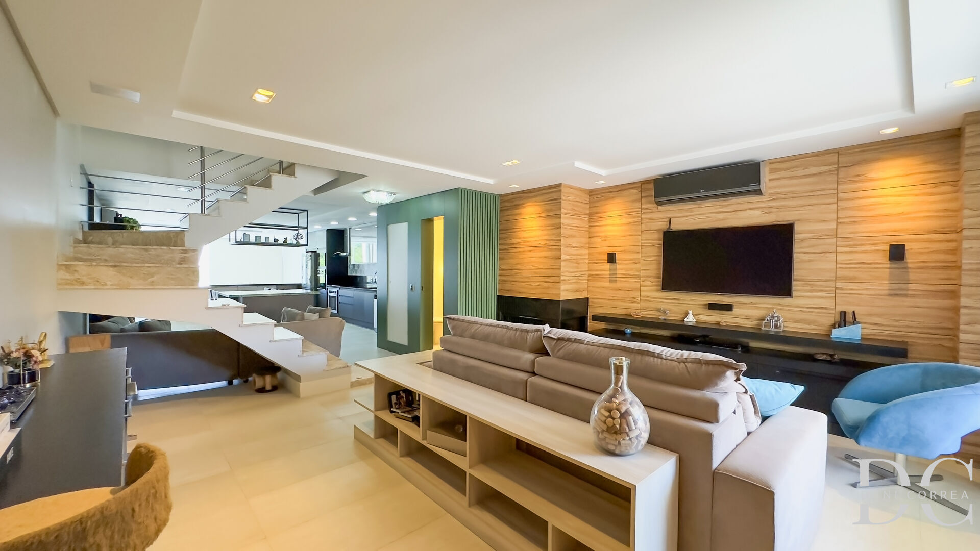 No piso principal temos o living aconchegante com lareira, lavabo e na ampla cozinha toda com móveis sob medida, desta cozinha já tem a vista do salão gourmet no piso inferior onde do gourmet já tem acesso ao pátio com piscina.